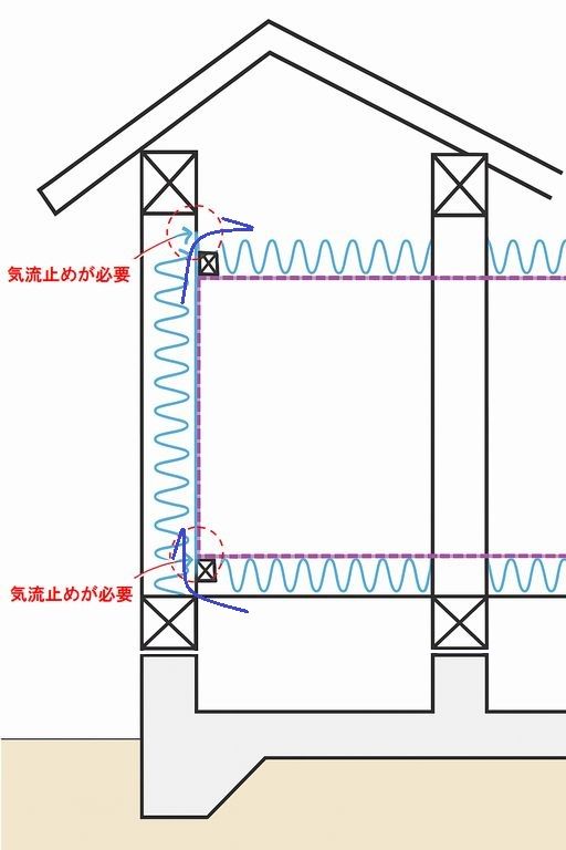 気流止めがない家では「断熱の穴」が開いているのと同じです。