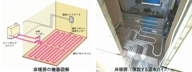 暖房原理 | 床下空間に設置した家庭用エアコンで空気を暖め、床下の温かい空気を床のスリットや隙間から室内に上昇させる「対流式」暖房 | 床に温水パイプや電熱線を埋設し、床そのものを温めて輻射熱で室内を暖める「輻射式」暖房 |