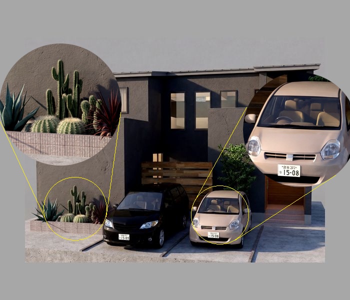 車の内装や花壇のサボテンも加えて、ジオラマのような様相に…!