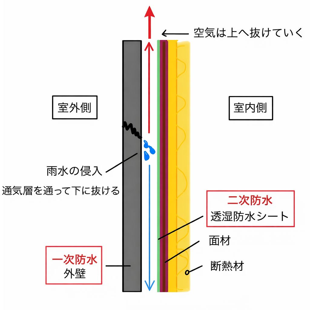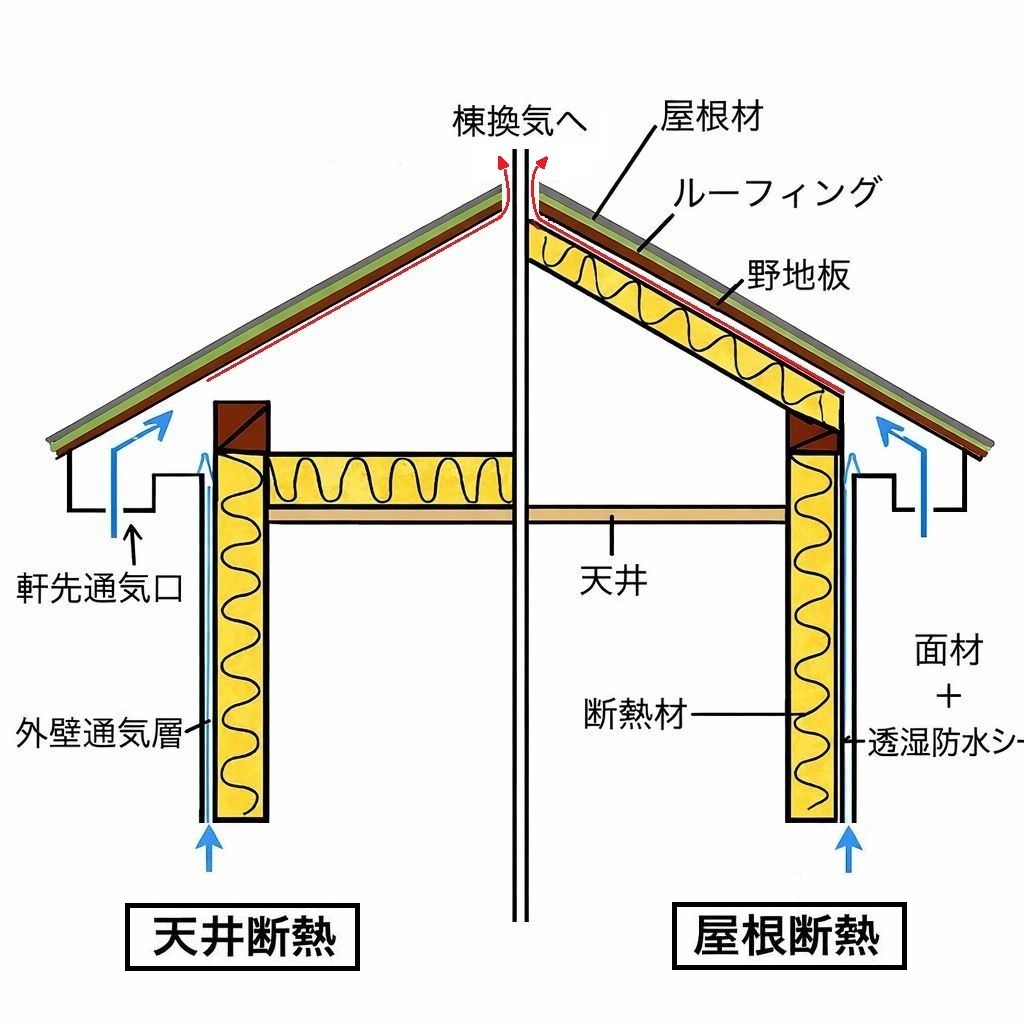ここで誤解されやすいのが通気の役割です。屋根の通気層はあくまで湿気を排出するためのものであり、壁の通気層のように水を排出する仕組みではありません。つまり、屋根の中に水が入らない前提で設計することが基本となります。
