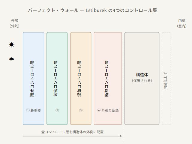 パーフェクト・ウォールとは「環境の分離体(environmental separator)」であり、外部を外に保ち、内部を内に保つことを目的とします。そのために、壁の構成は雨水・空気・湿気・熱の4つをコントロールしなければなりません。 Building Science