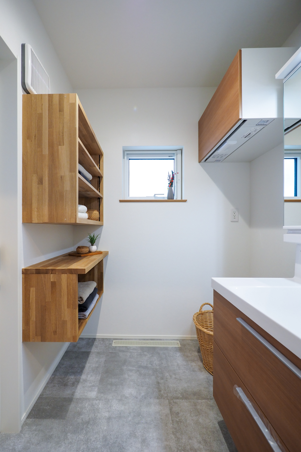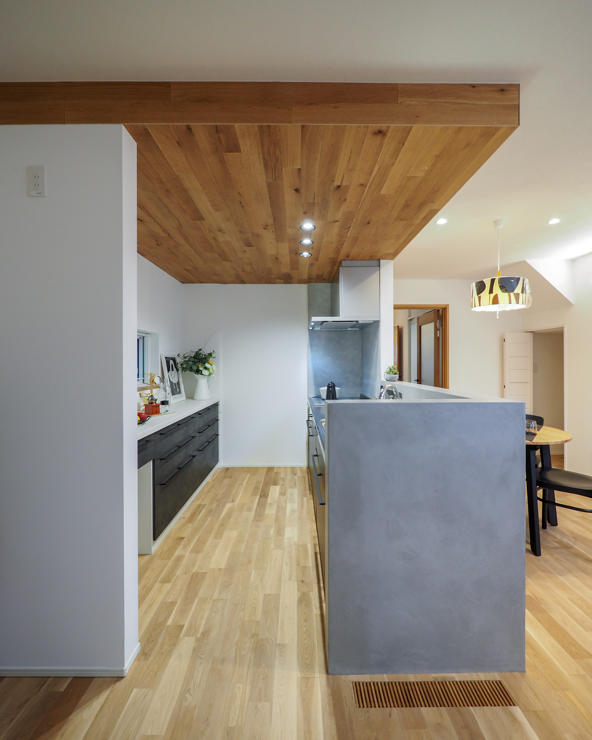 水回りでひときわ目を引くのが、モールテックスで仕上げた美しい造作キッチン。左官職人が手仕事で生み出す独特の風合い、つなぎ目のないデザイン。また、デザイン性だけでなく、水や汚れに強く耐久性にも優れた、毎日使う場所だからこその選択です。オーナー様こだわりのキッチンを、ぜひ現地でご覧ください。