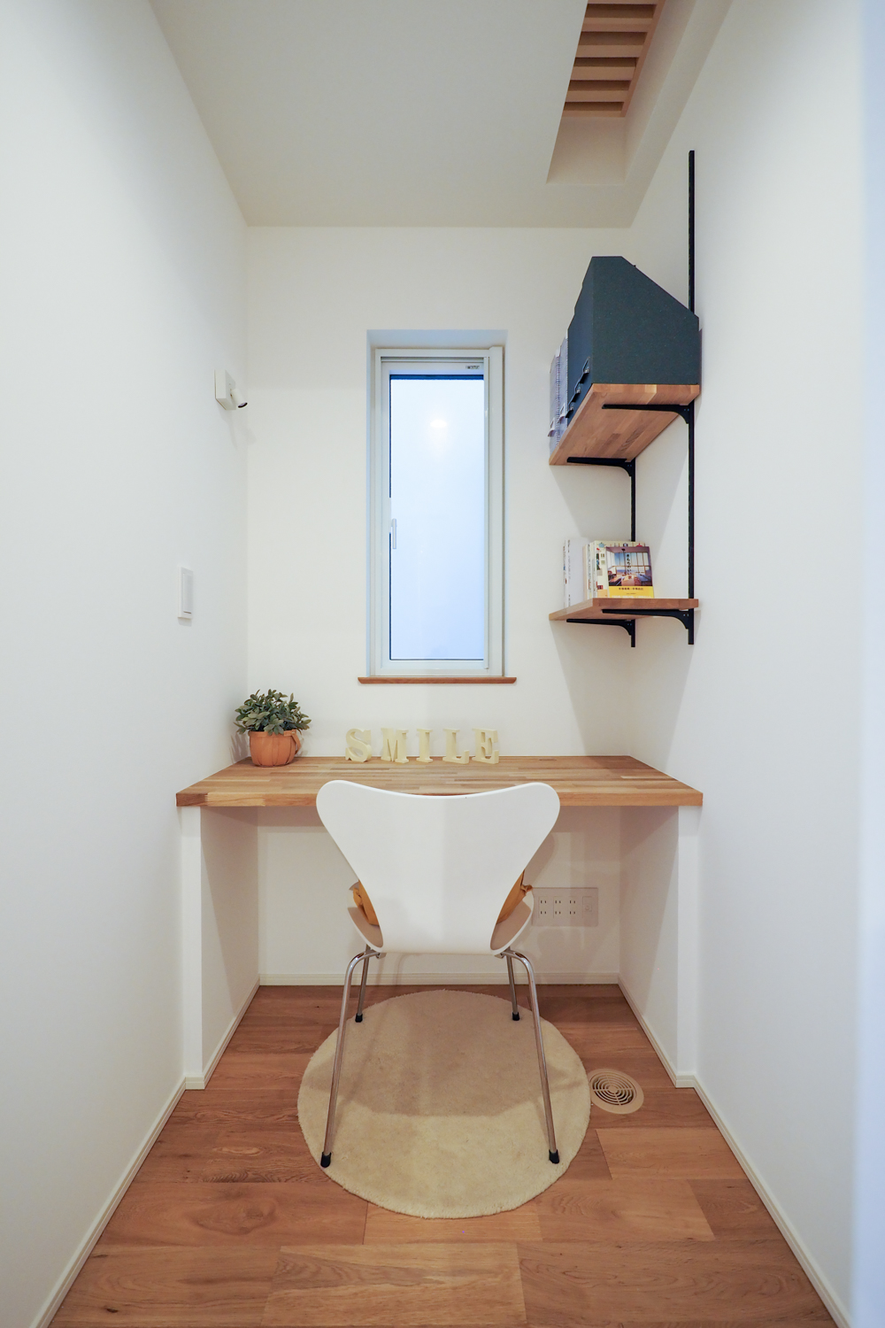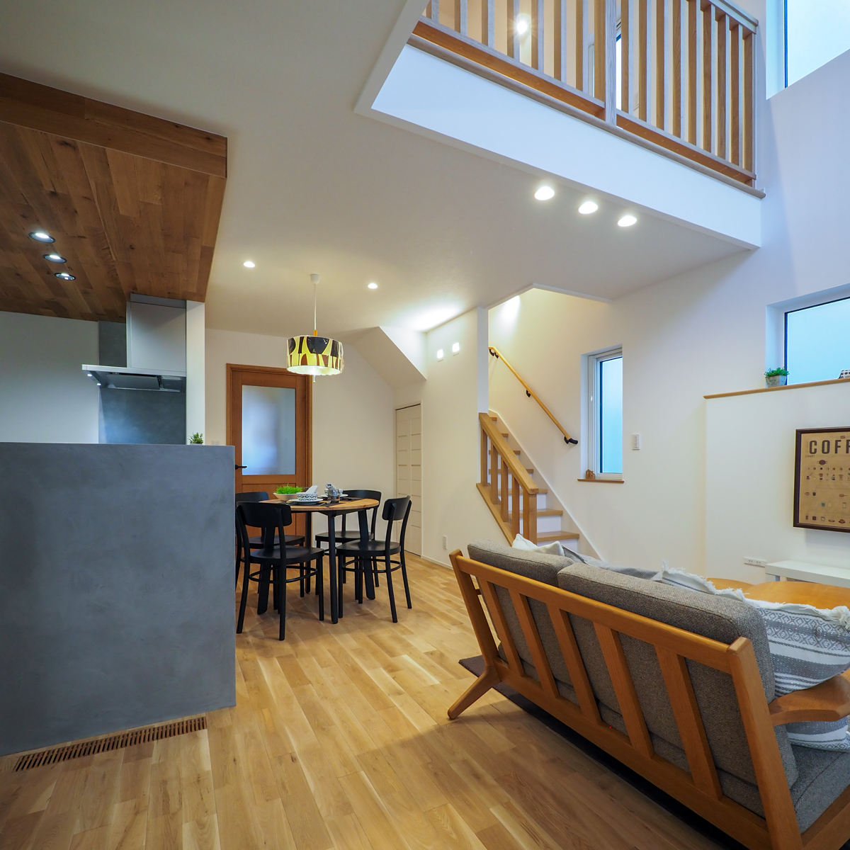 2階一体になった吹き抜けの設計は、家族の気配をいつも感じられる、心地よいつながりの中心。降りそそぐ光と、家中を通り抜ける健やかな風を、ぜひ感じてみてください。