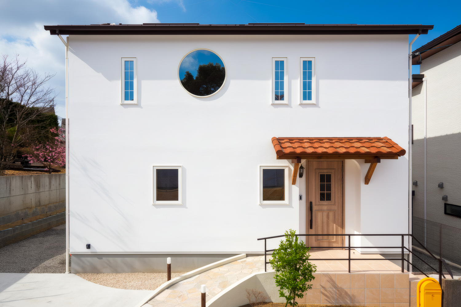 漆喰の白壁とオレンジ瓦が印象的な外観。吹抜けリビングにはキャットウォークと猫のシルエットアートを設け、インテリアは無垢の造作家具とタイルでコーディネートしました。丸窓が印象的な寝室や回遊できる家事動線など、デザインと機能性を両立した住まいです。