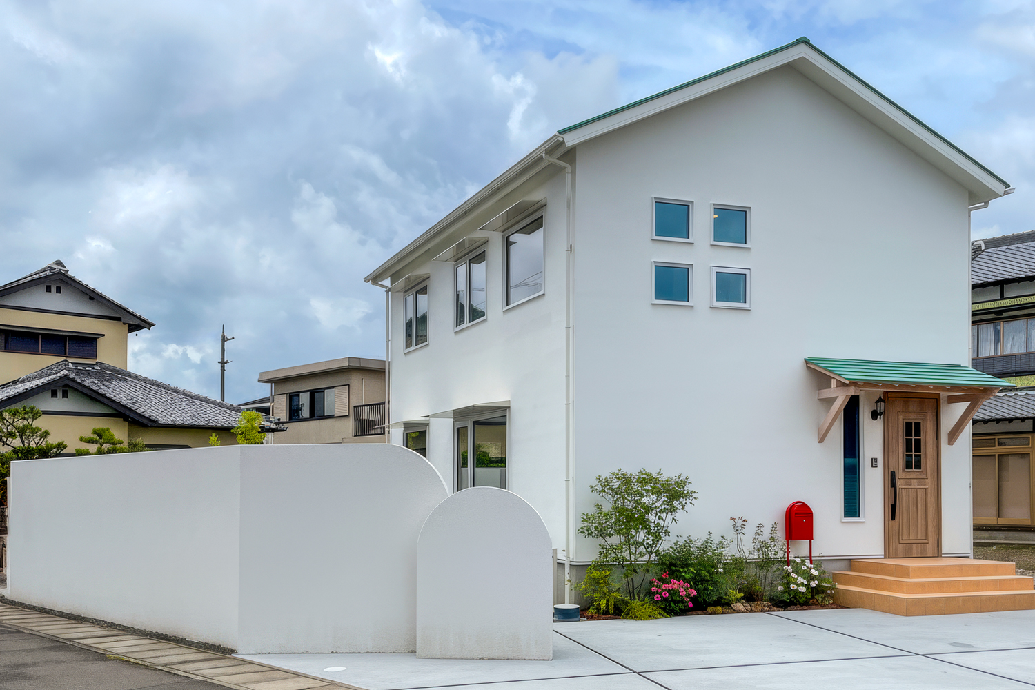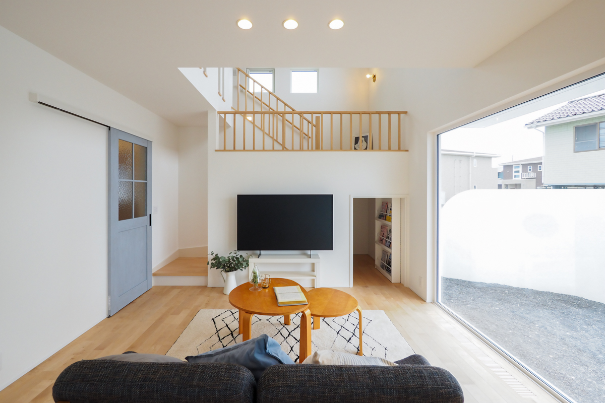 建物を真南に配置し、吹き抜けや大開口から光をしっかりと取り込む住まいに。スキップ階段の下には収納を設け、限られたスペースを無駄なく活用しています。玄関から手洗い、ファミリークローゼット、キッチンへと連なる直線の動線が、帰宅後の流れを整えつつ家事のしやすさにもつながっています。