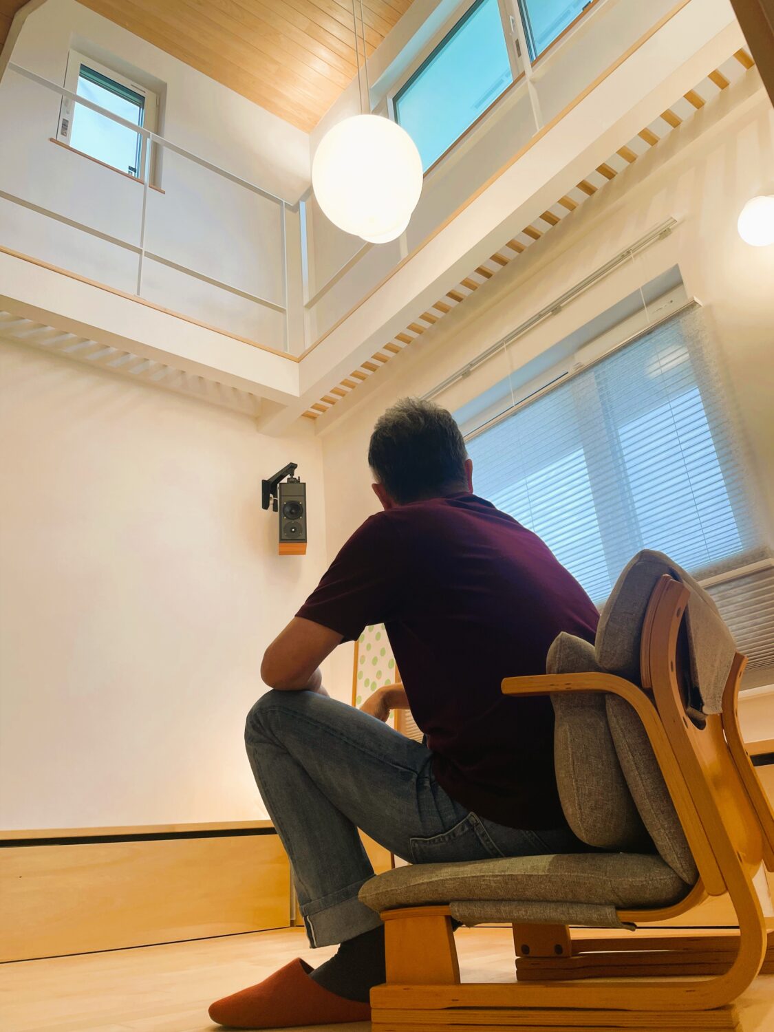 リビングに取り付けたスピーカーで、趣味のレコードを流しながらゆったり過ごしていただける快適で素敵なお家でした!
