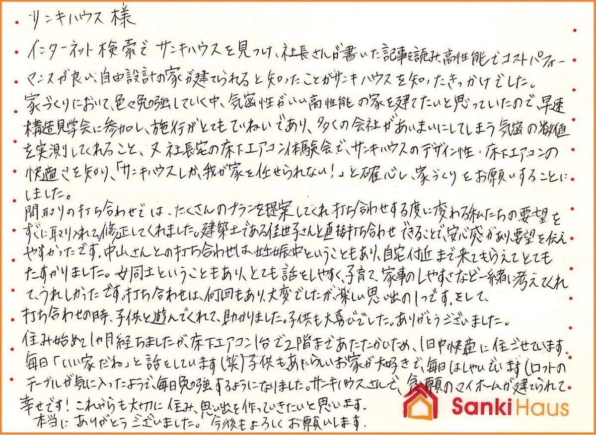 家づくりにおいて、色々勉強していく中、気密性がいい高性能の家を建てたいと思っていたので、早速構造見学会に参加し、施工がとてもていねいであり、多くの会社があいまいにしてしまう気密の数値を実測してくれること、又 社長宅の床下エアコン体験会で、サンキハウスのデザイン性・床下エアコンの快適さを知り、「サンキハウスしか、我が家を任せられない!」と確信し、家づくりをお願いすることにしました。
