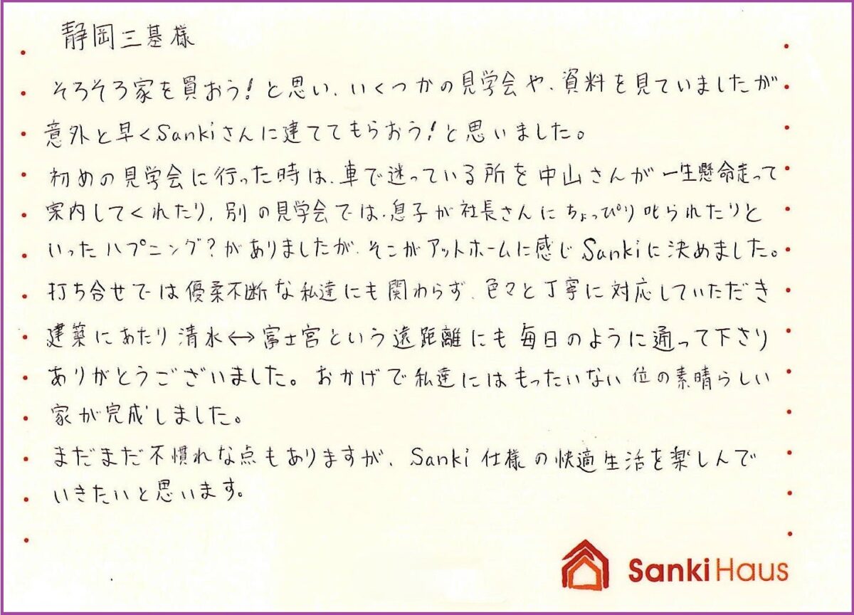 建築にあたり清水⇔富士宮という遠距離にも毎日のように通って下さりありがとうございました。